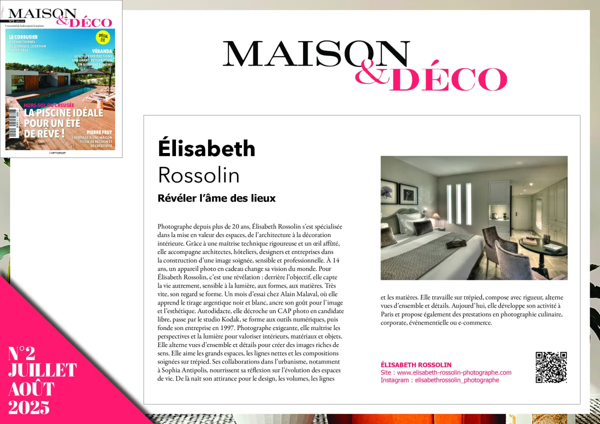Je partage avec mes clients, hôteliers, architectes, designer, agence de communication presse magazine, entrepreneurs, artisans d'art, le même souci de perfection visuel.